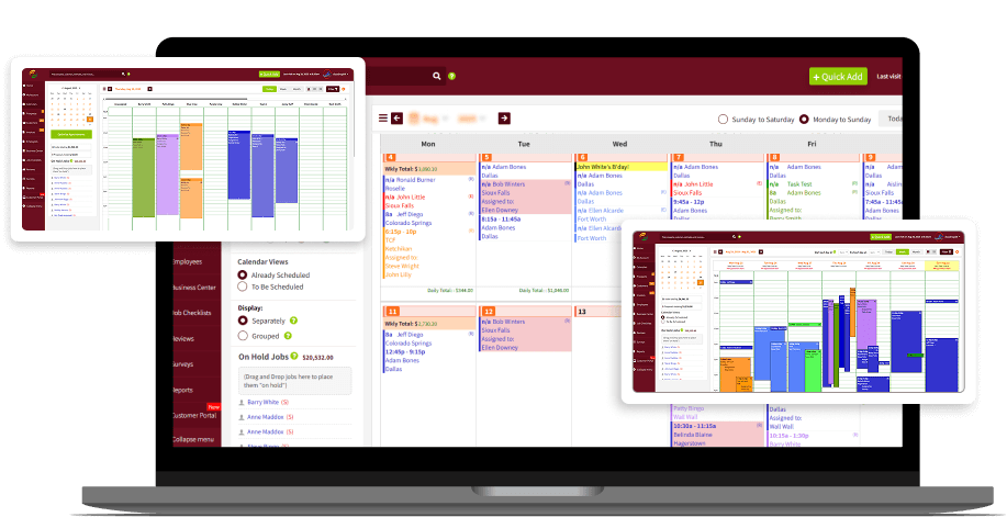 We have calendars within calendars. This is serious stuff. Many different views (appt type, employee, crew, list, display, etc.) are available along with filters galore to give you the exact info you want to see! You can also email/print work orders, invoices, and estimates from the calendars with one click.