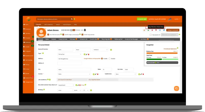 We have a complete integration with Google maps. Most users simply navigate to the job or estimate by clicking on the teardrop next to the appt in the mobile app. However, you can also print directions from within any profile as you can see on the left. There is even a street view in both the mobile app and software for you to get a visual of the property.