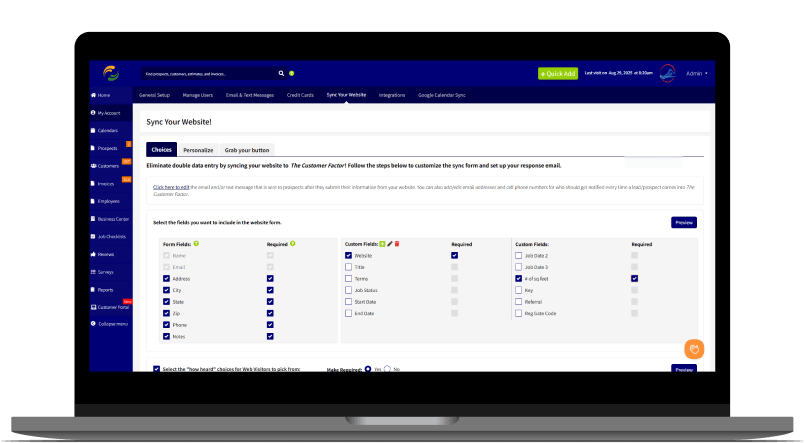 Connect your website to The Customer Factor and eliminate time spent on double data entry! You simply place the script available to you on any of your webpages. Choose from our buttons or create your own button. Or just link to a button already on your website.