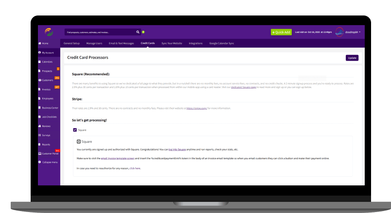 Available within our “Pro” tier your customers will be able to have their own personalized portal they can log into (one click login). They can make requests, see appts, view their invoices, store their credit cards, pay their bills, and much more!