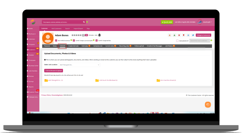 For photos and videos, most of the time this is done within our mobile app. There is a “Photo” and “Video” button for any prospect or customer. So if you do an in person estimate or need to take some photos or videos while on a job site you can easily do it within the mobile app and they will be part of their profile forever!