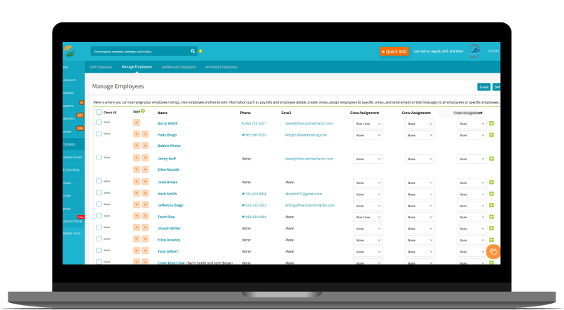 Keep track of their pay, email or send messages to any employee, track PTO, Vacation days, sick days, upload important docs into their profile and filter appts on the calendars based on any employee or crew. And you can even upload a photo and some bio information to their profile which can be included in the email to customer (if that employee is assigned to the job then the automated confirmation and appt reminder will automatically include employee photo and bio info in the email if you set it up to do so).